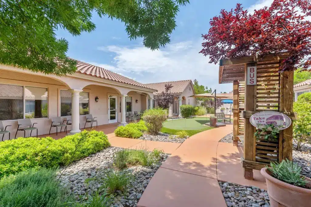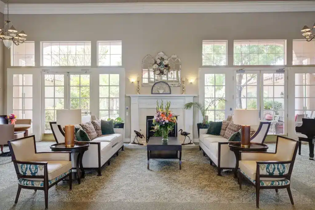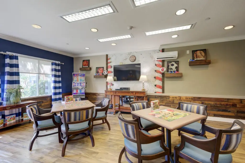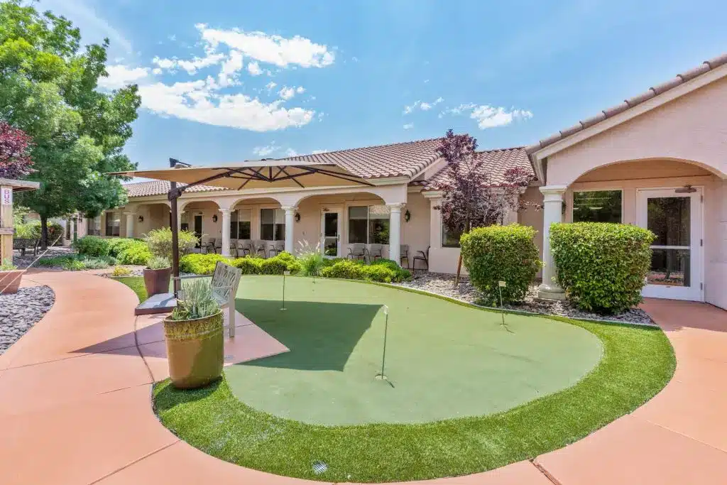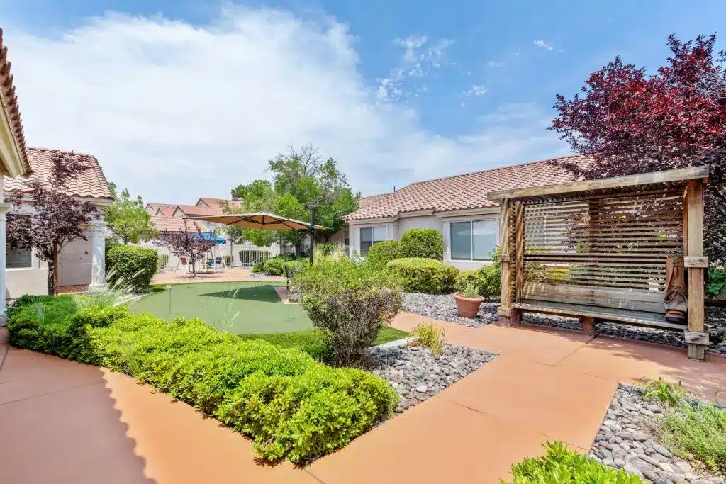 Life Enrichment here means more than activities, each month, residents might join a walking tour of Sahara West, garden in the sunshine, try their hand at desert flower arranging, or groove to a Rat Pack revue. There are comedy socials, movie nights with popcorn on the lawn, putting contests, music therapy, and immersive virtual reality tours (including neon-lit Vegas Strip nostalgia). Families and pets are always welcome, in fact, family “guest chefs” sometimes take over the kitchen, sharing favorite dishes and stories with all.