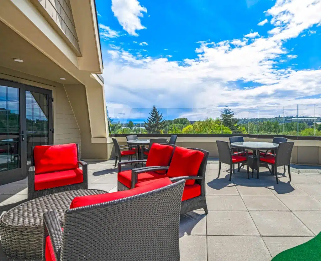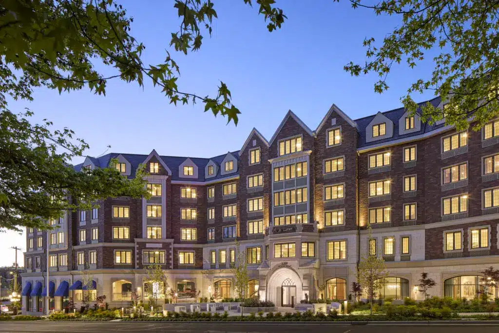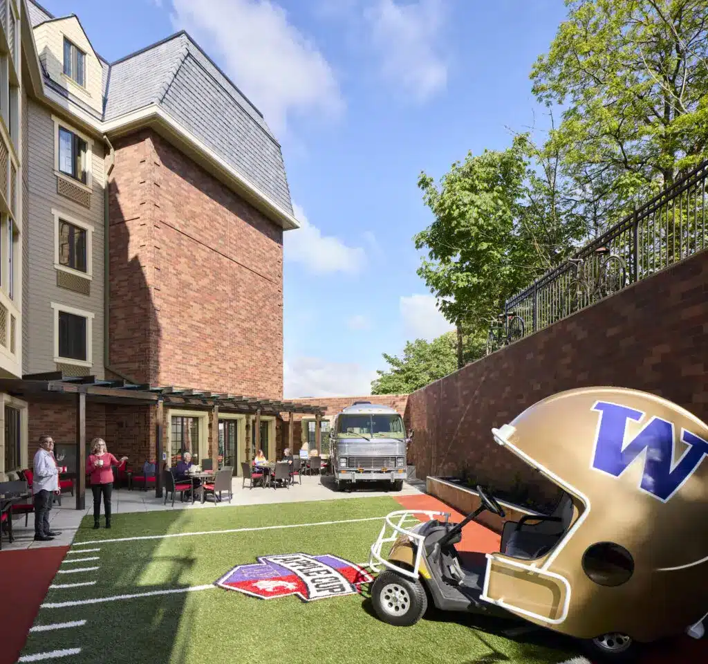 Nestled in Seattle’s historic Laurelhurst neighborhood, visible from the main university approach and overlooking the Burke-Gilman Trail, Aegis Living Laurelhurst invites residents to be part of something truly special. Purpose-built to serve as both a landmark and a haven, this community stands out for its Collegiate Gothic architecture inspired by the stately buildings of the University of Washington and the nearby quaint Tudor homes. From its regal, three-gabled entryway to its boomerang-shaped layout (with a hidden subterranean wing that hugs the hillside), Laurelhurst feels “grand and grounded,” offering visual drama and a sense of organic belonging from the moment you arrive.